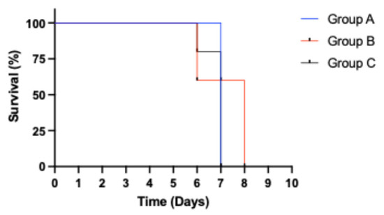 Kaplan–Meier survival analysis showing time of survival for animals in the different dose groups. Only pigs in Group A (0.5 mL) survived to 6 dpi without a mortality event.