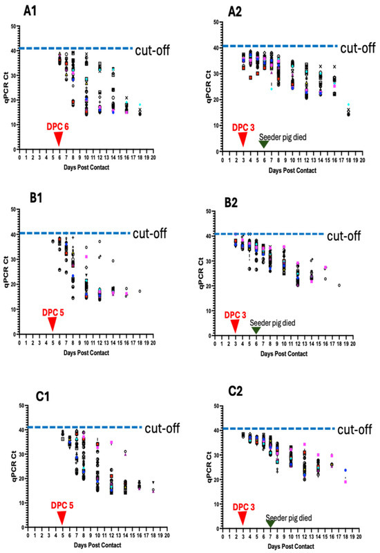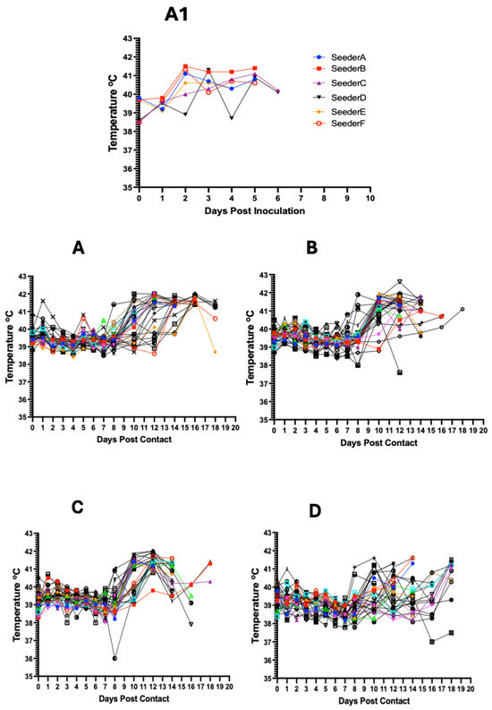 Kinetics of rectal temperature in contact pigs in response to ASFV infection. The overall trend shows increasing rectal temperatures from 10 dpc onwards with the onset of severe clinical symptoms (A–F); each temperature curve represents response of an individual pig. Temperature response in seeder pigs shows an increase at 2–3 dpi (A1).
