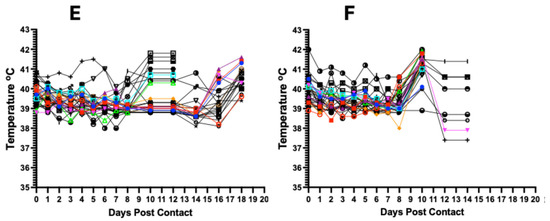 Inoculation of the seeder pigs with 0.5 mL of the spleen homogenate resulted in elevated rectal temperature response by 2–3 dpi and onset and development of clinical signs by 2–4 days (Figure 3A1 and Figure 4A). The majority of contact pigs in the six pens exhibited an increase in rectal temperatures, starting at 10–11 dpc, and in several cases, a decrease in rectal temperatures below the normal in pigs exhibiting severe clinical signs or in the terminal stages of disease progression (Figure 3A–F). Clinical observations in contact pigs depicted an onset of rising mean clinical scores at 7–8 dpc in Pen A, B, E, and F and at 10 dpc in Pen C and D (Figure 4B).