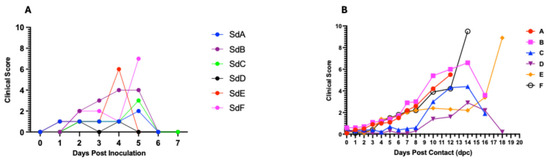 Dynamics of clinical scores in seeder (A) and in contact pigs (mean score) for each per pen (B). The data shows rising clinical scores over time with the onset of clinical signs and progression of the disease.