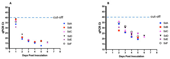 To evaluate potential utility of environmental sampling to support ASF surveillance, composite fecal swabs were collected daily from the middle and the four corners of each pen using sterile polyester-tipped swabs in 1 mL of sterile PBS from 0 to 8 dpc. Similarly, composite water nipple swabs were also taken from each pen using individual sterile polyester-tipped swabs in 1 mL of VTM from 0 to 10 dpc. These samples were stored at −80 °C until processing for DNA extraction.