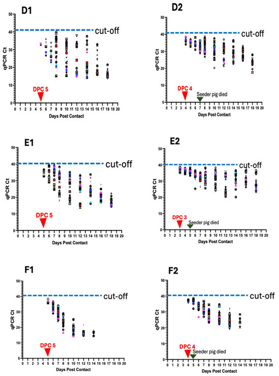 Initial detection of ASFV DNA in the blood of contact pigs occurred at 5 dpc in 7 pigs (23.3% positivity), within a Ct value range of 35.56–38.41 (Figure 6F1; Table 1). Twenty-two animals (73.3%) tested positive at 6 dpc (Ct value range: 30.45–37.12) and 28 pigs (93.3%) at 7 dpc (Ct values range: 24.13–33.64). There was 100% positivity at 8 dpc (Ct values range 14.22–27.52) and afterwards (Figure 7A). The Ct values decreased over time from 1 dpc to 14 dpc (Figure 6F1). Seeder Pig F died at 5 dpi. Initial detection of ASFV DNA in the oropharyngeal swabs occurred at 4 dpc in 9 pigs (30% positivity), within a Ct value range of 32.04–35.6 (Figure 6F2; Table 1). The proportion of pigs testing positive increased to 73.3% (22/30) at 5 dpc (Ct value range: 34.11–35.97), 86.7% (26/30) at 6 dpc (Ct value range: 26.74–35.97), and 100% at 8 dpc (Ct value range 24.63–30.89) and afterwards (Figure 7B). There was a temporal reduction in Ct values from 1 dpc to 14 dpc (Figure 6F2).