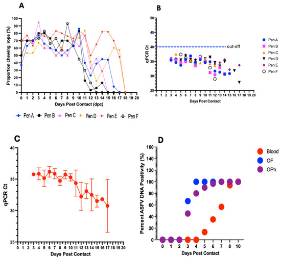 Evaluation of aggregate oral fluids. Dynamics in the proportion of pigs chewing on the rope in the different pens (A–F) at different timepoints postcontact. On average, more than 60% of pigs in each pen chewed on the rope from 1–10 dpc (A). ASFV DNA detection in aggregate oral fluids with initial positive detections at 3 dpc in 4 of the 6 pens and in all pens at 4 dpc and afterwards (B). Genomic detection demonstrates a decreasing trend in mean Ct values with an increase in viral load (C). Comparison of the sensitivity of ASFV DNA detection in whole blood, oropharyngeal (OPh) swabs, and aggregate oral fluids (OFs) (D).