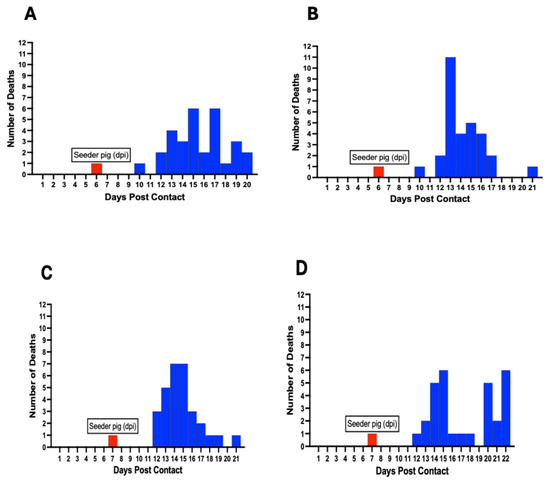 The temporal dynamics in the proportion of pigs positive for ASFV genomic material in the blood and oropharyngeal swabs (Figure 7A,B) and the mortality curves (Figure 9) are in keeping with previous studies, demonstrating that ASFV in a swine herd spreads slowly but steadily, taking up to a few weeks from the beginning of an incursion to the appearance of overt disease, requiring time to detect the virus in contact pigs [34,56]. The proportion of pigs positive at the early stages of viral DNA detection varied between pens, which may depend on the hyperactive behavior of the seeder pig and the extent of virus shedding and contamination of the environment. However, we observed the virus spread rapidly through the herd and infected nearly all pigs in all pens by 8–10 dpc. The uneven spread of the virus among the different pens is in keeping with the lack of uniformity in the mortality curves among the pens (Figure 9). The first 2 deaths occurred at 10 dpc, with a significant number of deaths occurring only after 12 days (almost 2 weeks) post-introduction of the seeder pigs, thus supporting the observation about the stealthy nature of initial ASFV incursion.