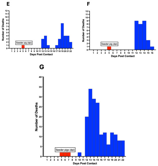 Mortalities among contact pigs occurred between 10 and 22 dpc, with the earliest deaths occurring in Pen A and B at 10 dpc (Figure 9). The first deaths in Pen C, D, E, and F occurred at 12 dpc (Figure 9). There was non-uniformity in the mortality curves for the different pens, with Pen F showing the highest number of daily mortalities, occurring between 12 and 16 dpc (Figure 9F). Cumulatively, the highest number of deaths on a single day across all six pens was observed between 12 and 15 dpc, accounting for more than half (61%, 110/180) of the mortalities (Figure 9G).
