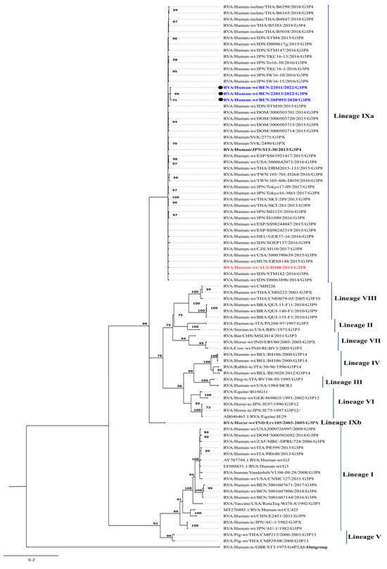 All strains were categorized within lineage IV among the fourteen recognized lineages to date [32,50,51]. They exhibited nucleotide and amino acid similarities ranging from 98.7% to 100% and 99.8% to 100%, respectively, among themselves. These strains, along with the D388 strain, constitute clade IV-1a. Within this clade, strains isolated in 2022 (RVA/Human-wt/BEN/22011/2022/G3P[8] and RVA/Human-wt/BEN/22013/2022/G3P[8]) demonstrated distinct clustering from the strain isolated in 2020 (RVA/Human-wt/BEN/20P093/2020/G3P[8]).