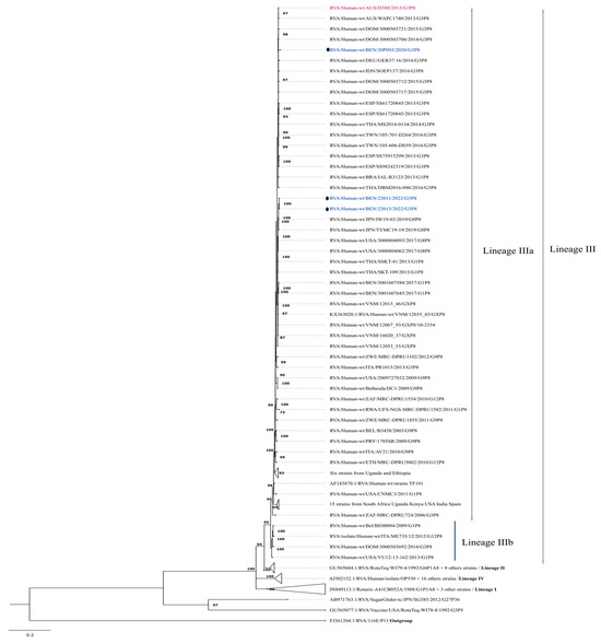 The strain isolated in 2020, RVA/Human-wt/BEN/20P093/2020/G3P[8], clustered within lineage VI, exhibiting nucleotide and amino acid similarities of 98.5% to 99.8% and 97.7% to 99.4%, respectively, with other lineage VI strains.