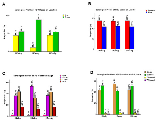 Serological profile of participants positive for HBsAg, HBeAg, and HBcrAg based on (A) Location; (B) Gender; (C) Age, and (D) Marital status.