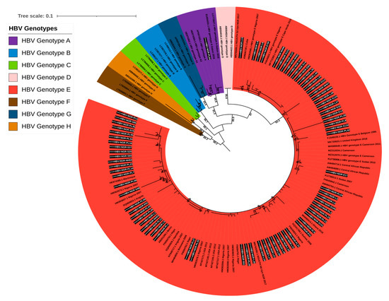 To determine which HBV group the Nigerian sequences belonged to, the S gene sequences were subjected to the online Genome Detective hepatitis B virus database (https://www.genomedetective.com/app/typingtool/hbv/ (accessed on 16 February 2025)). Subsequently, reference sequences of all human HBV genotypes (HBV genotypes A–H) were downloaded from the NCBI Virus database for phylogenetic analysis. The sequences were aligned using MAFFT version 7 and phylogenetic analysis was performed using IQ-TREE version 1.6.12 [32] with ModelFinder [33], and the tree was visualized using Interactive Tree of Life (iTOL) v6 [34]. We also examined all the S gene sequences generated in this study for mutations in the MHR and a-determinant domain. To determine substitutions in the BCP/PC gene sequences from this study, we aligned the sequences with reference wildtype (X75657.1) and mutant (KM606740) strains, respectively.