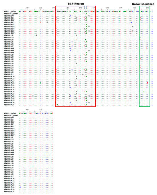 Alignment of partial BCP region gene sequences showing various mutations at the BCP region (highlighted in red) and Kozak sequence region (highlighted in green).