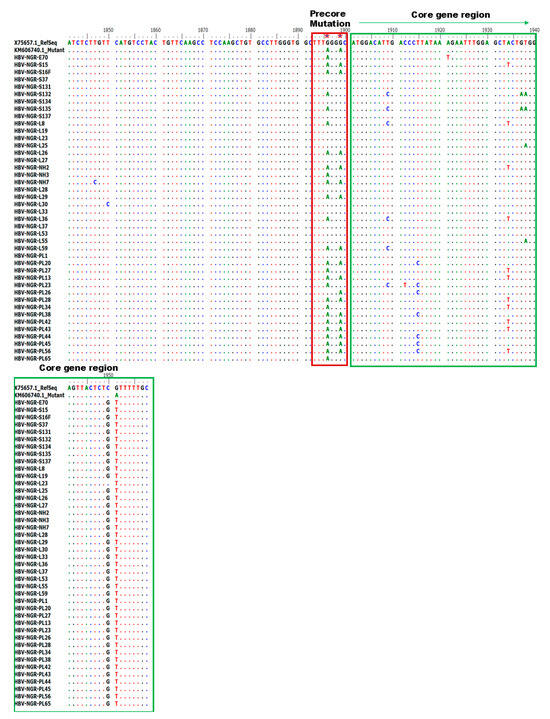 - Sobajo, O.A.; Oguzie, J.U.; Adegboyega, B.; Eromon, P.; Happi, C.; Komolafe, I.; Folarin, O. Detection of Immune Escape and Basal Core Promoter/Precore Gene Mutations in Hepatitis B Virus Isolated from Asymptomatic Hospital Attendees in Two Southwestern States in Nigeria. Viruses 2023, 15, 2188. [Google Scholar] [CrossRef]