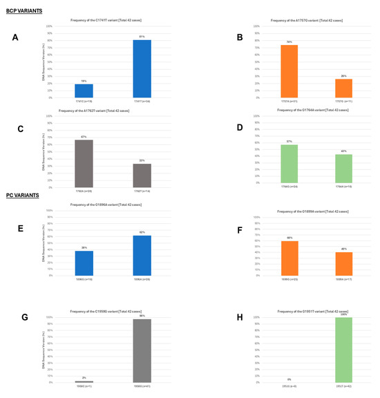 The frequency of dominant BCP and PC variants identified among the study participants, Based on frequency of variants in 42 cases (A) C1741T; (B) A1757G; (C) A1762T; (D) G1764A; (E) G1896A; (F) G1899A; (G) C1950G; and (H) G1951T.