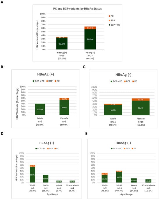 The distribution of BCP and PC variants across HBeAg (+) and HBeAg (−) participants is shown in Figure 7A–E. A higher proportion of the BCP + PC variant was observed in HBeAg (−) individuals (88.9%) compared to HBeAg (+) individuals (33.3%), suggesting a potential association between this variant and HBeAg seroconversion or absence. Figure 7B–E further break down these findings by gender and age range within both HBeAg (+) and HBeAg (−) groups. Notably, the BCP + PC variant consistently dominated among HBeAg (−) individuals across both genders and most age ranges, while HBeAg (+) individuals showed a more mixed distribution, with varying contributions from the BCP and PC variants depending on gender and age, though BCP + PC was still present.