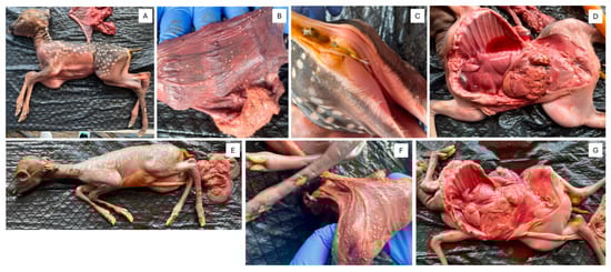 A two-year-old WTD (OV1659) was found experiencing a stillbirth on a farm in Central Florida, on 5 June 2022. An emergency c-section was performed by a veterinarian in the afternoon of the same day. OV1659 was healthy prior to the procedure but deteriorated after two 6-month-old fetuses (OV1660 and OV1661) were removed, and the doe was euthanized. A whole blood (WB) specimen from OV1659 was collected by the owner into a 3 mL BD Vacutainer EDTA tube (Becton Dickinson, Franklin Lakes, NJ, USA). The University of Florida (UF) Cervidae Health Research Initiative (CHeRI) team performed necropsies on the two fetuses on the morning of 6 June 2022. During the necropsy, photos of the animals and each specimen were documented. Fresh hepatic tissues (HT), kidney tissues (KT), placenta tissue (PT), and spleen tissues (ST) were collected from both animals. Tissue specimens were stored in 5 mL snap-cap Eppendorf tubes (Thermo Fisher Scientific, Waltham, MA, USA). All specimens were kept on ice immediately after collection and were stored at −80 °C upon arrival at the UF College of Veterinary Medicine laboratory for virology tests at a later time.