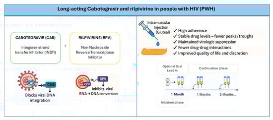 - Davis, J.M.; Rana, A.; Sax, P.E.; Bares, S.H. Long-Acting Cabotegravir Plus Rilpivirine in People with HIV with Adherence Challenges and Viremia: Current Data and Future Directions. Clin. Infect. Dis. 2025, 80, 1349–1354. [Google Scholar] [CrossRef]