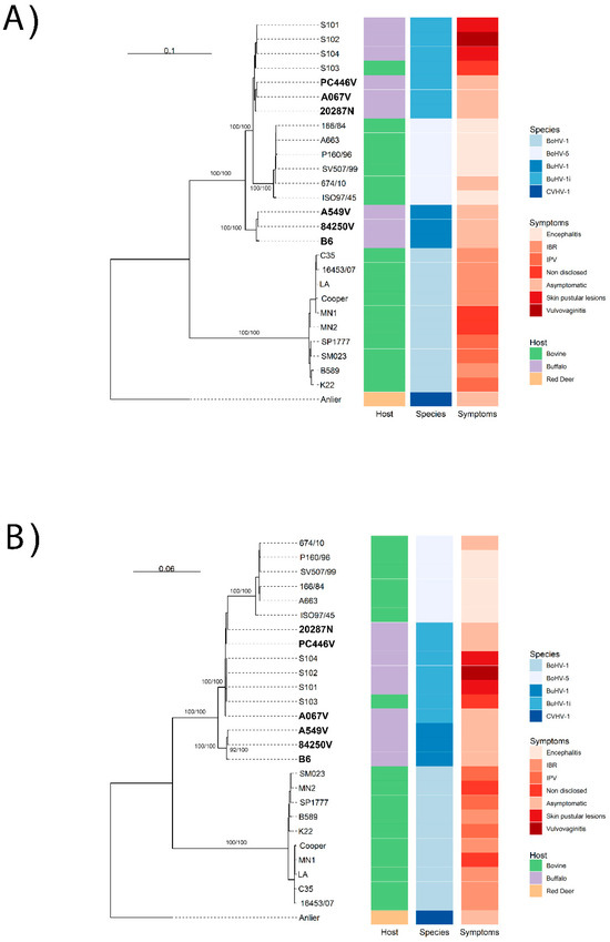 Nucleotide Phylogenetic Analyses based on the complete genome (A) and CDS (B) of BuHV-1 and BoHV-5. Maximum likelihood phylogenetic tree based on whole-genome and CDS alignment (excluding recombinant regions), with BoHV-1 and CvHV-1 as outgroups. Argentine isolates are highlighted in phylogenetic trees. The isolates, host species, and clinical signs are also displayed side-by-side for each phylogenetic tree.