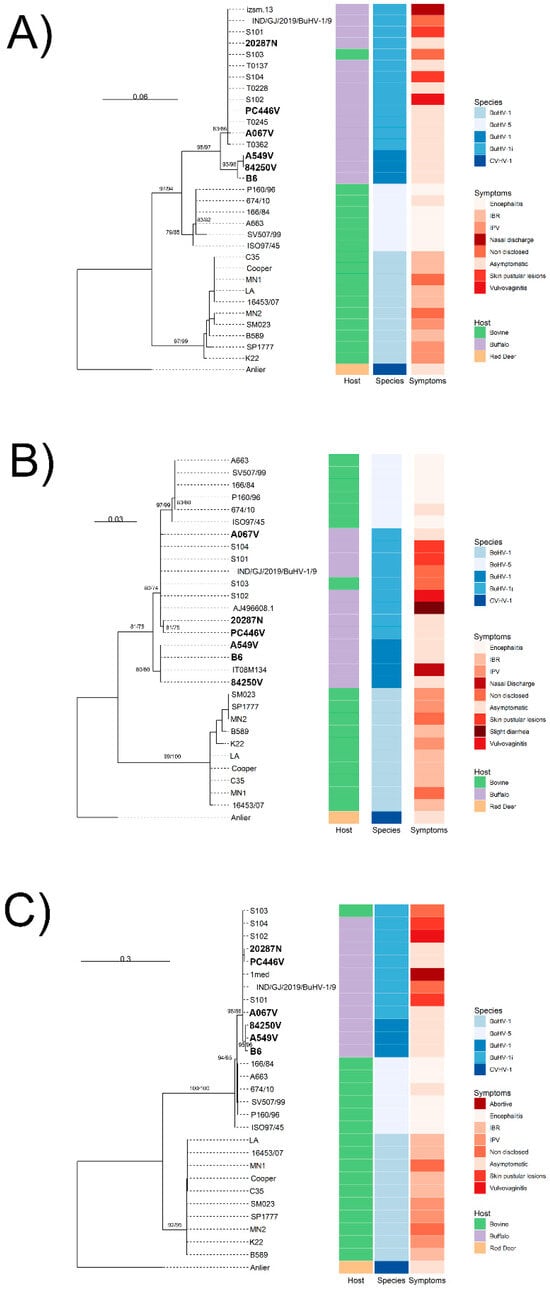 Whole-genome and CDS phylogenetic trees (Figure 1A,B), excluding recombinant regions, revealed a BuHV-1 lineage that is distinct from BoHV-5 and BuHV-1 strains. Within BuHV-1, strains B6, A549V, and 84250V formed a clade sharing a recent common ancestor. The A067V, PC446V, 20287N, and Indian strains (S101–S104) displayed a paraphyletic basal arrangement (Figure 1A,B). These paraphyletic strains are tentatively designated as BuHV-1 indeterminate (BuHV-1i) (Figure 1). Partial gC, gD, and gE phylogenies from clinical isolates showed similar topologies, except for gC, which formed two distinct BuHV-1 subclades (Figure 2A). Only the gD fragment of the Italian strain IT08M134 clustered with B6; the other gC and gD fragments from different clinical samples aligned with BuHV-1i.