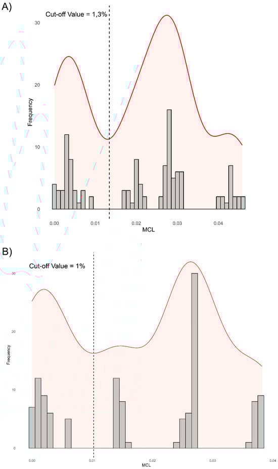 Analysis of nucleotide distances between BuHV-1 and BoHV-5 strains at the genomic level and CDS: pairwise distances in the BoHV-5, BuHV-1, and BuHV-1i alignment were calculated using Mega 11 [], and the frequencies were plotted using the R package (https://cran.r-project.org/). A kernel density plot was also generated and combined with the distance frequencies. (A) Kernel density plot of whole-genome pairwise distances, with a species-level cut-off at 1.3% (vertical line). (B) Kernel density plot of CDS pairwise distances, with a cut-off at 1.0%.