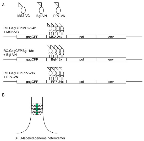 In this study, we used two different stem-loop aptamer systems combined with bimolecular fluorescence complementation (BiFC) to specifically visualize retroviral genome heterodimers within cells. We constructed plasmids to express the MCP fused to the N-terminal half of the Venus fluorophore (MS2-VN) paired with constructs expressing the C-terminal half of the Venus fluorophore fused to either Bgl binding protein (Bgl-VC) or PCP (PP7-VC). When two retroviral genomes containing distinct RNA aptamers bound to VN or VC are in close proximity, the Venus fluorophore will be reconstituted to generate fluorescence visible by microscopy [35,36,37,38,39]. Normally, fluorescently tagged MS2, Bgl, and PP7 proteins have diffuse signals in the cell unless bound to their respective RNA aptamers. With BiFC, there is less diffuse background signal because there will only be fluorescence when the proteins bind their target RNAs and the RNAs dimerize, reforming the Venus fluorophore. Using this approach, we demonstrated that BiFC-labeled genome dimers are visible as functional fluorescently labeled punctate foci that traffic through the cell and interact with viral Gag proteins. The BIFC labeling system for RNA labeling can be used in both fixed-cell imaging and live-cell imaging with minimal background fluorescence.