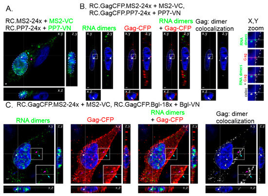 3.3. BiFC-Labeled Genome Heterodimers Co-Localize with GagCFP in the Cytoplasm and at the Plasma Membrane