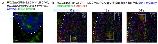 Live-cell imaging of nuclear RSV genome heterodimers. (A) QT6 cells were transfected with plasmids expressing RC.GagCFP.MS2-24x, RC.GagCFP.PP7-24x, PP7-VN, and MS2-VC. DRAQ5 was used to visualize the nucleus (blue). A genome heterodimer was tracked in the nucleus within a single confocal z-slice imaged approximately every 3 s. In a still image obtained at 24 s, a genome heterodimer (green focus) was visible within the nucleus (blue, dashed line). (B) QT6 cells were transfected with plasmids encoding RC.GagCFP.MS2-24x, RC.GagCFP.Bgl-18x, Bgl-VN, and MS2-VC. Sun1-mCherry was used to mark the inner leaflet of the nuclear membrane (blue). A complex containing RNA genome dimer (green) with Gag-CFP (red) colocalized in the nucleus and trafficked together. A colocalization channel (white) is shown in the upper right corner of the image, indicating that the red and green foci were overlapping. Scale bar = 0.5 µm.