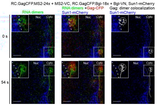 BiFC-labeled genome heterodimers were visualized co-localizing with Gag-CFP in the fixed cells shown in Figure 2. We sought to further characterize dynamic interactions of genome heterodimers and Gag using live-cell microscopy (Figure 4, Supplementary Videos S1–S3). QT6 cells were co-transfected with plasmids expressing retroviral genomes containing MS2 or Bgl RNA stem-loops and a Gag-CFP fusion protein (RC.GagCFP.MS2-24x and RC.GagCFP.Bgl-18x), the split fluorophore-tagged binding proteins (MS2-VC and Bgl-VN), and Sun1-mCherry to label the inner nuclear membrane. A single Z-plane was imaged approximately every 3 s. Colocalization between BiFC-labeled genome heterodimer foci (green) and Gag-CFP (red) was assessed via the generation of a colocalization channel (white). We then performed particle tracking of the heterodimers (green), Gag-CFP (red), and the colocalized signal (white). We focused on colocalized genome heterodimers and Gag-CFP foci that remained together throughout the duration of the movie (54 s), as demonstrated by the green (dimer), red (Gag), and white (colocalization) tracks in Figure 4. The Gag-genome heterodimer complex trafficked together over time in the cytoplasm, along the outer aspect of the nuclear membrane (labeled by Sun1 in blue and indicated by a white dashed line). The insets show an enlarged image of the tracked co-localized foci containing Gag and genomic RNA foci.