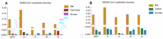 Nucleotide diversity in the ORF1ab, S, E, M, and N genes of SARS-CoV and MERS-CoV isolated from bats, carnivores (for SARS-CoV) or camels (for MERS-CoV), and human hosts. (A) SARS-CoVs. (B) MERS-CoVs.
