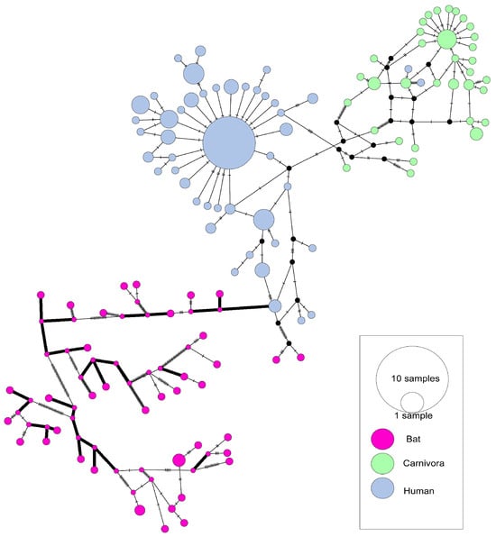 In the SARS-CoVs haplotype network diagram, bat, carnivore, and human isolates form distinct clusters, each representing an independent evolutionary branch. Bat-isolated SARS-CoVs exhibit significant genetic diversity, with multiple haplotypes separated by extended branches (Figure 2), indicating high population diversity and prolonged evolutionary history within their natural hosts. The carnivore and human clusters are directly connected by short branches (≤3 mutation steps), supporting the role of civets as intermediate hosts. Concurrently, we identified multiple sites under positive selection pressure, including residues 147, 227, 462, 479, and 609 within the S protein of isolates SARS-CoV derived from carnivorous hosts (Table 2). This indicates that SARS-CoV underwent adaptive evolution in carnivore hosts prior to zoonotic spillover into humans [31]. Human-isolated SARS-CoVs haplotype form an independent, star-shaped radiation cluster, indicating the presence of super-spreaders, consistent with epidemiological evidence [47]. The cross-species transmission of SARS-CoV is dependent on adaptive evolution within carnivore hosts, with human infections predominantly arising from a single dominant viral lineage. Thus, controlling intermediate hosts may effectively interrupt viral transmission. Network topology analysis indicates a limited potential for direct zoonotic transmission from bats to humans; nevertheless, intensified surveillance at wildlife–animal market interfaces remains essential.