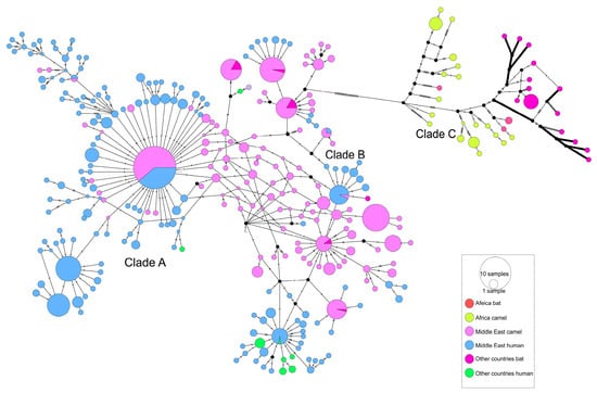 A haplotype network was constructed using MERS-CoV S gene sequences. A total of 308 haplotypes were identified in these sequences. As shown in Figure 3, Middle Eastern dromedary camel MERS-CoVs were divided into multiple clusters, most of which were shared between dromedary camels and humans. African dromedary camel MERS-CoVs formed a distinct single cluster (clade C) that differs from MERS-CoVs present in humans and camels from other regions (clades A and B). In the time-scaled haplotype network, analyses of MERS-CoV showed a 2014–2015 haplotype surge (Supplemental Figure S2), correlating epidemiologically with the 2014 Saudi Arabian outbreak and 2015 Korean nosocomial transmission [19,44]. Subsequent endemicity was evidenced by temporally diffuse haplotypes without chronological gradients, suggesting frequent zoonotic reintroductions and sustained local transmission with recurrent viral gene flow.
