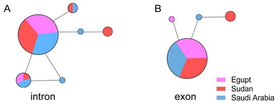 Haplotype networks of exon and intron regions of DPP4 gene. (A) Intron region. (B) Exons.
