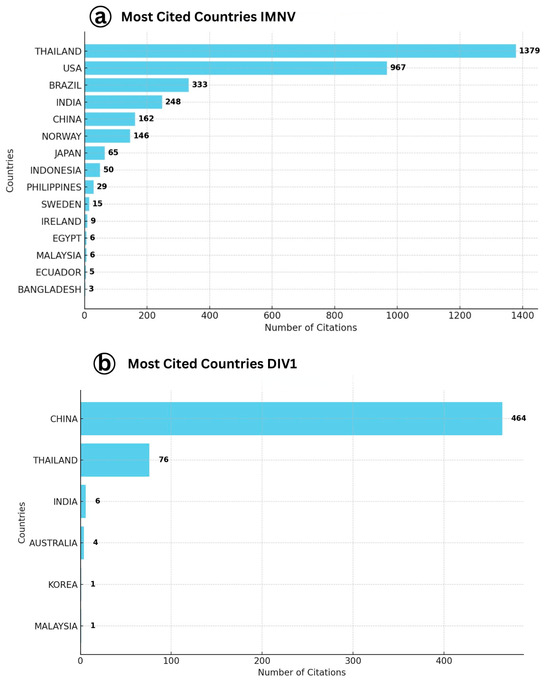 (a) Details showing the most cited countries with number of citations on Infectious Myonecrosis Virus (IMNV) between 2005 and 2025 (Thailand: 1379) and (b) Decapod Iridescent Virus 1 (DIV1) between 2015 and 2025 (China: 1230).