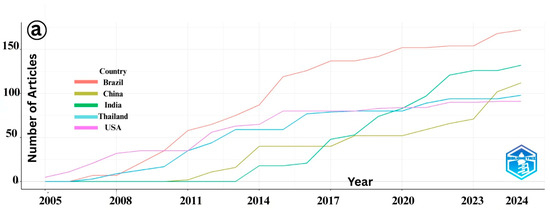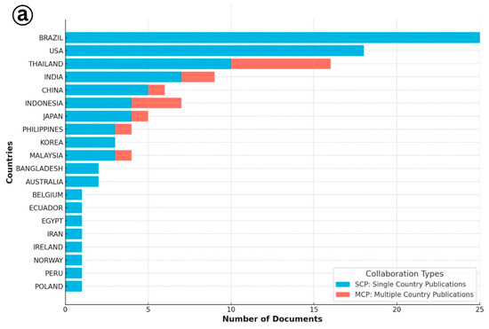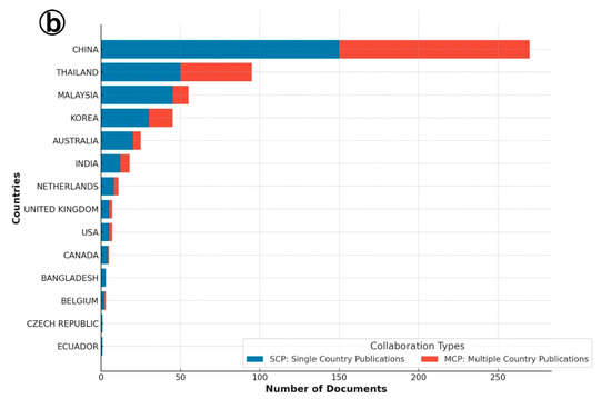 The analysis of institutional collaborations in IMNV research revealed both international and domestic partnership trends (Figure 9a). Notably, strong collaborative linkages between South Korea and the USA, as well as India and Sweden, demonstrate the international dimension of IMNV research. These partnerships often stem from bilateral projects, student exchange programs, and co-authorship publications in peer-reviewed journals [22]. Conversely, institutions in China, Brazil, and Thailand were found to engage primarily in intra-national collaborations. This pattern may reflect the availability of robust national research funding, domestic shrimp aquaculture priorities, and institutional research capacities within these countries [21].