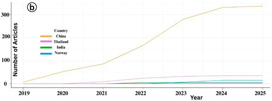 An analysis of the publication trends on IMNV reveals a general increase in scientific output from the top five contributing countries, such as Brazil, China, India, Thailand, and USA, reflecting their active engagement in addressing this viral threat to shrimp aquaculture [18] (Figure 3a). However, a plateau in publication output was observed in India and Thailand after 2016, indicating a potential shift in research priorities or changes in resource allocation within these countries. In contrast, research on DIV1 shows a marked and continuous rise in publications, predominantly driven by China (Figure 3b). Since DIV1 was first identified in Chinese aquaculture systems, the country has maintained it. This sustained effort is likely due to the substantial economic impact of DIV1 on China’s shrimp and crayfish farming industries, which has prompted extensive studies aimed at understanding and mitigating the virus’s effects.