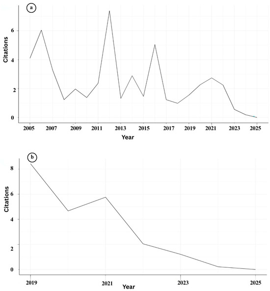 The bibliometric evaluation of IMNV research reveals fluctuating trends in both publication output and citation impact over the past two decades (Figure 4a and Table 3). The Average Citation Per Publication (ACPP) peaked in 2012 for IMNV, with another significant increase in 2016, indicating the release of influential studies or heightened scholarly attention during these periods [17]. The highest number of IMNV-related publications was recorded in 2024, suggesting a recent resurgence in research interest, which was potentially driven by the emergence of novel IMNV variants reported in Brazil [18]. However, notable declines in publication numbers were recorded in 2010, 2013, 2018, and 2023, indicating intermittent research engagement within the research community. These fluctuations suggest that while IMNV continues to be a relevant research topic, it is periodically overshadowed by emergent pathogens or evolving priorities in aquaculture health management.