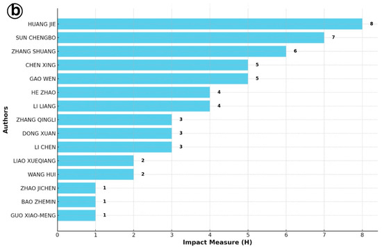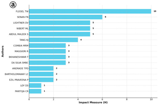Similarly, in the case of DIV1, an emerging pathogen of concern in shrimp and crayfish aquaculture, the h-index-based analysis revealed Huang Jie, associated with the Network of Aquaculture Centres in Asia-Pacific (NACA), as the leading contributor. He was followed by Sun Chengbo and Shuang Zhang from Guangdong Ocean University, China. These researchers have led several important studies focusing on the early detection, molecular characterization, and pathogenicity of DIV1, particularly in the Chinese aquaculture sector, where the virus has caused significant concern since its first report [9].