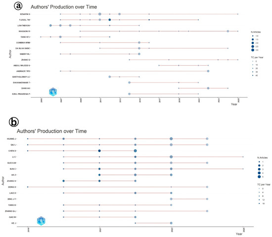 (a) Authors’ production over time of the scientific articles published on Infectious Myonecrosis Virus (IMNV) between 2005 and 2025 and (b) Decapod Iridescent Virus 1 (DIV1) between 2015 and 2025.