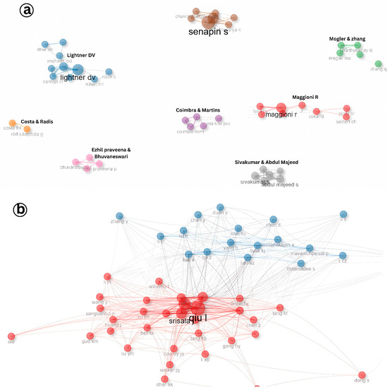 (a) Collaboration pattern of author research on Infectious Myonecrosis Virus (IMNV) between 2005 and 2025 and (b) Decapod Iridescent Virus 1 (DIV1) between 2015 and 2025.