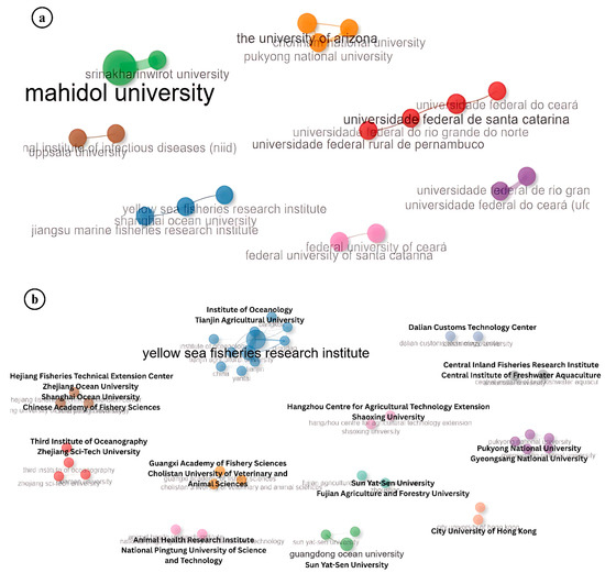 (a) Collaboration pattern of institutions in research on Infectious Myonecrosis Virus (IMNV) between 2005 and 2025 and (b) Decapod Iridescent Virus 1 (DIV1) between 2015 and 2025.
