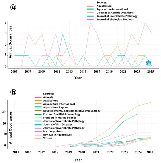 (a) Impact of journals in research on Infectious Myonecrosis Virus (IMNV) between 2005 and 2025 and (b) Decapod Iridescent Virus 1 (DIV1) between 2015 and 2025.
