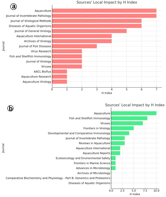 (a) Local impact analysis of journals in research on Infectious Myonecrosis Virus (IMNV) between 2005 and 2025 and (b) Decapod Iridescent Virus 1 (DIV1) between 2015 and 2025.