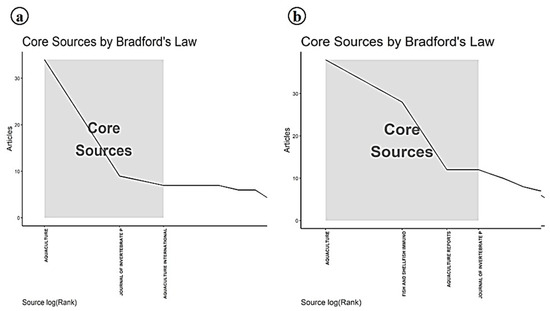 (a) Bradford’s law analysis of journals in research on Infectious Myonecrosis Virus (IMNV) between 2005 and 2025 and (b) Decapod Iridescent Virus 1 (DIV1) between 2015 and 2025.