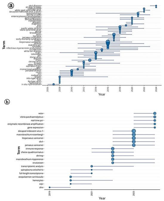 Additionally, the sustained presence of species-specific terms like Penaeus vannamei and Litopenaeus vannamei reflects the continued dominance of this species in global shrimp aquaculture and its central role in most virological research. Meanwhile, the recurrence of keywords, such as gene expression, immune response, and transcriptomic analysis, denotes long-standing and increasingly sophisticated efforts to understand host–pathogen interactions at the molecular level. These insights are paving the way for the development of targeted disease interventions and selective breeding programs aimed at enhancing disease resistance.