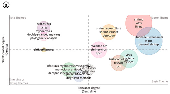 In the motor themes, keywords such as shrimp aquaculture, viruses, detection of WSSV, IHHNV, and real-time PCR reflect a high level of active research development in core areas of IMNV research. Notably, viral interference between WSSV and IMNV has been documented with the help of qPCR techniques [27]. The basic themes include PCR and histopathology, underscoring the continued relevance of these foundational techniques for the accurate identification of IMNV in shrimp farming. Meanwhile, in the emerging field, monoclonal antibodies, DIV1, and IMNV show declining research efforts in those research topics. However, molecular diagnostic assays continue to play a vital role in preventing disease outbreaks, thereby safeguarding the sustainability and productivity of shrimp farming [28]. The availability of monoclonal antibodies for IMNV and the widespread use of molecular detection techniques may explain the current classification in the emerging field (Figure 14a).