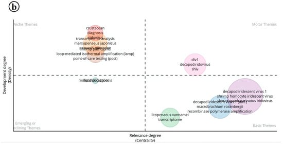 (a) Thematic analysis of research on Infectious Myonecrosis Virus (IMNV) between 2005 and 2025 and (b) Decapod Iridescent Virus 1 (DIV1) between 2015 and 2025.