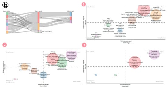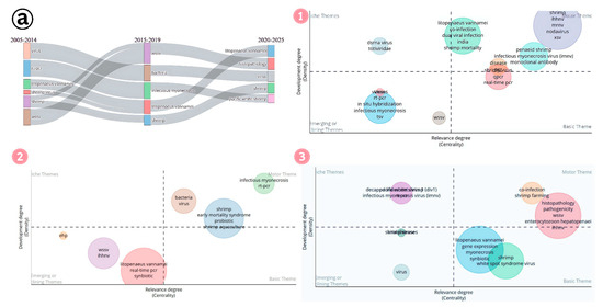 (a) Thematic evolution of research on Infectious Myonecrosis Virus (IMNV) between 2005 and 2025: (1) Initial phase (2005–2014). (2) Mid phase (2015–2019). (3) Latest phase (2020–2025). (b) Thematic evolution of research on Decapod Iridescent Virus 1 (DIV1) between 2019 and 2025: (1) Initial phase (2019–2021). (2) Mid phase (2022–2023). (3) Latest phase (2024–2025).