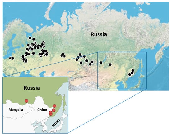 Geographic distribution of tick collections in Russia. Tick collection locations are marked with black circles. YEZV positive tick collection locations are marked with red circles.