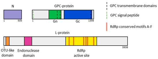 Schematic representation of the coding region of the Russian YEZV isolates genome organization. Putative proteins and domains encoded by the Russian YEZV isolates genome: N (purple), Gn (green), Gc (blue), OTU-like domain (orange), endonuclease domain (purple), and RdRp active site (yellow). In addition, the following are presented: transmembrane domains of GPC-protein (black dotted line), signal peptide of GPC-protein (green dotted line), and conserved motifs of Nairoviridae RdRp A-F (red double lines).