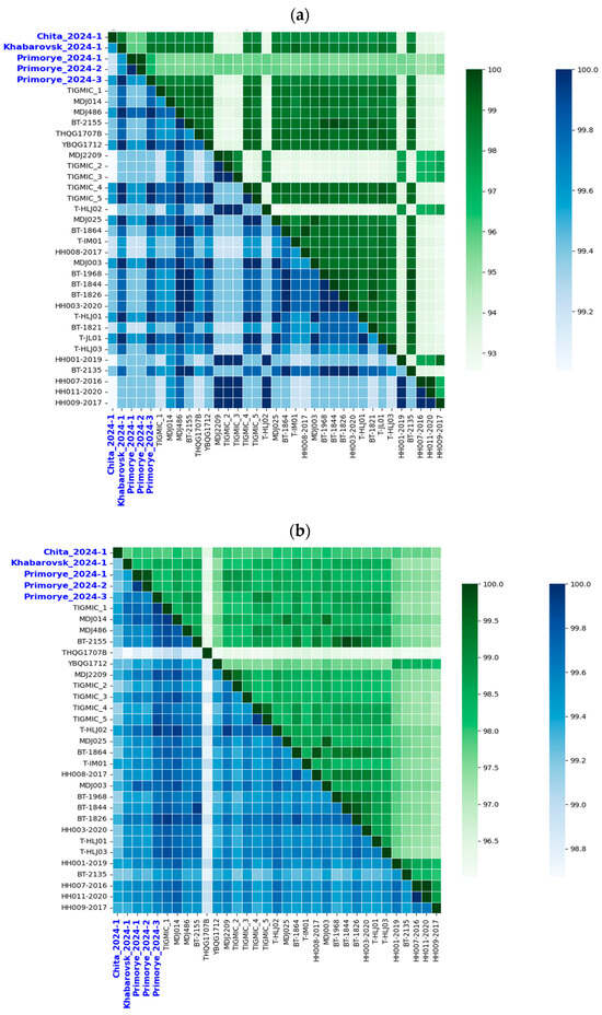 All available complete genome sequences were downloaded for YEZV (n = 33) from NCBI (https://www.ncbi.nlm.nih.gov/labs/virus), accessed on 10 February 2025 and their sequence information was recorded. Multiple sequence alignment was performed using MEGA X (PSU, Philadelphia, PA, USA). These programs were also used to calculate sequence identities. A custom Python script was developed using the Biopython library to compute pairwise sequence identity matrices (https://github.com/AlexeiYanshin/heatmap/blob/main/heatmap_pairwise_alignment.ipynb (accessed on 24 July 2025)). The analysis was performed using Python v3.12.7 with the following libraries: Biopython v1.85 for sequence parsing and manipulation, Pandas v2.2.3 for data handling, Seaborn v0.12.2, and Matplotlib v3.7.2 for visualization.