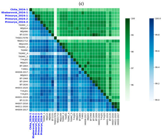 Pairwise sequence identity matrix of YEZV genome segments. (a) Identity matrix of YEZV S segment; (b) identity matrix of the YEZV M segments; (c) identity matrix of YEZV L segments. YEZV sequences are indicated by name of isolate. Russian YEZV isolates are colored blue. Pairwise nucleotide identity matrix is highlighted in green. Pairwise amino acid identity matrix is highlighted in blue.