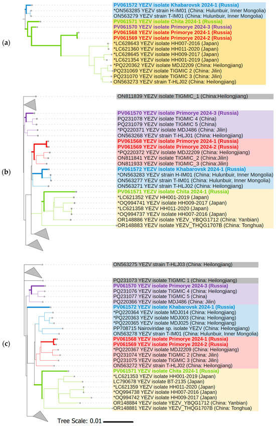 Phylogenetic analysis was performed using YEZV ORF nucleotide sequences from the S, M, and L segments to investigate the evolutionary relationships and genetic diversity of the five Russian YEZV isolates relative to previously known YEZV isolates with complete cds available at GenBank (n = 33). There is no clear clustering of known YEZV isolates by geographic location or host. According to the phylogenetic tree for YEZV S segment, Russian YEZV isolates are divided into two main YEZV clades. YEZV Khabarovsk 2024-1 isolate is included in one of them (blue clade), and YEZV Primorye 2024-1, YEZV Primorye 2024-2, YEZV Primorye 2024-3, and YEZV Chita 2024-1 isolates are included in the other (yellow clade) (Figure 4a). While according to the phylogenetic trees for YEZV M segment and YEZV L segment, a division of Russian YEZV isolates into four clades is observed. YEZV Primorye 2024-1 and YEZV Primorye 2024-2 isolates together form one clade (red clade). YEZV Khabarovsk 2024-1 (blue clade), YEZV Primorye 2024-3 (purple clade), and YEZV Chita 2024-1 (yellow clade) isolates form their own separate clades (Figure 4b,c). YEZV Chita 2024-1 isolate clusters with Japanese YEZV isolates associated with acute febrile illness, recovered from tick-bite patients.